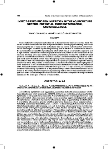 Toviho, Odunayo A. and Kovács, László and Bársony, Péter (2020) Insect-based Protein Nutrition in the Aquaculture Sector: Potential, Current Situation, and Challenges. ÁLLATTENYÉSZTÉS ÉS TAKARMÁNYOZÁS, 69 (2). pp. 142-154. ISSN 0230-1814
