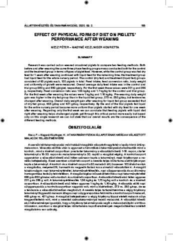 Nesz, Péter and Nagyné Kiszlinger, Henrietta (2020) Effect of physical form of diet on piglets’ performance after weaning. ÁLLATTENYÉSZTÉS ÉS TAKARMÁNYOZÁS, 69 (2). pp. 155-162. ISSN 0230-1814