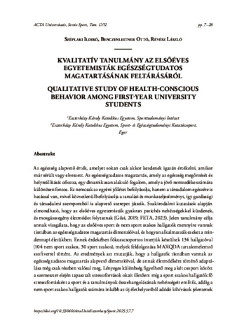 Az egészség alapvető érték, amelyet sokan csak akkor kezdenek igazán értékelni, amikor már sérült vagy elveszett. Az egészségtudatos magatartás, amely az egészség megőrzését és helyreállítását célozza, egy dinamikusan alakuló fogalom, amely a jövő nemzedéke számára különösen fontos. Ez nemcsak az egyéni jóllétet befolyásolja, hanem a társadalom egészére is hatással van, mivel közvetlenül befolyásolja a tanulási és munkateljesítményt, így gazdasági és társadalmi szempontból is alapvető szerepet játszik. Szakirodalmi kutatások alapján elmondható, hogy az elsőéves egyetemisták gyakran pszichés nehézségekkel küzdenek, és mozgásszegény életmódot folytatnak (Gősi, 2019; FETA, 2023). Jelen tanulmány célja annak vizsgálata, hogy az elsőéves sport és nem sport szakos hallgatók mennyire vannak tisztában az egészségtudatos magatartás dimenzióival, és hogyan alkalmazzák ezeket a mindennapi életükben. Ennek érdekében fókuszcsoportos interjúk készültek 134 hallgatóval (104 nem sport szakos, 30 sport szakos), melyek feldolgozása MAXQDA tartalomelemző szoftverrel történt. Az eredmények azt mutatják, hogy a hallgatók tisztában vannak az egészségtudatos magatartás alapvető dimenzióival, de annak életmódként történő adaptálása még csak részben valósul meg. Lényeges különbség figyelhető meg a két csoport között a szemeszter elején tapasztalt stresszforrások okait illetően: míg a sport szakos hallgatók fő stresszforrásként a sport és a tanulmányok összehangolásának nehézségeit említik, addig a nem sport szakos hallgatók számára inkább az új élethelyzetből adódó kihívások jelentenek nehézséget. Az észlelt probléma mérséklésére vagy megszüntetésére célszerű gyakorlati intézkedéseket alkalmazni. | Health is a fundamental value that many people only begin to truly appreciate once it has been compromised or lost. Health-conscious behavior, which aims to preserve and restore health, is a dynamically evolving concept that holds particular significance for future generations. This behavior not only influences individual well-being, but also has a broader impact on society, as it directly affects learning and work performance, thus playing a crucial role from both economic and social perspectives. According to the academic literature, first-year university students frequently experience psychological difficulties and tend to lead sedentary lifestyles. The aim of the present study is to examine the extent to which first-year students enrolled in sport-related and non-sport-related academic programs are aware of the dimensions of health-conscious behavior, and how they incorporate these into their daily lives. To this end, focus group interviews were conducted with 134 students (104 from non-sport-related programs and 30 from sport-related programs), and the data were analyzed using MAXQDA content analysis software. The results indicate that while students are aware of the core dimensions of health-conscious behavior, its integration into their lifestyles is only partially realized. A significant difference was observed between the two groups regarding the sources of stress experienced at the beginning of the semester: students in sport-related programs primarily cited difficulties in balancing sports and academic responsibilities, whereas students in non-sport-related programs reported challenges related to adapting to their new life circumstances. To mitigate or eliminate the causes of these stressors, the implementation of appropriate practical measures is recommended.