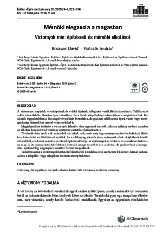 Bozsaky, Dávid and Veöreös, András (2025) Mérnöki elegancia a magasban : Víztornyok mint építészeti és mérnöki alkotások = Engineering Elegance at Altitude : Water Towers as Architectural and Engineering Works. ÉPÍTÉS-ÉPÍTÉSZETTUDOMÁNY, 53 (3-4). pp. 323-346. ISSN 0013-9661