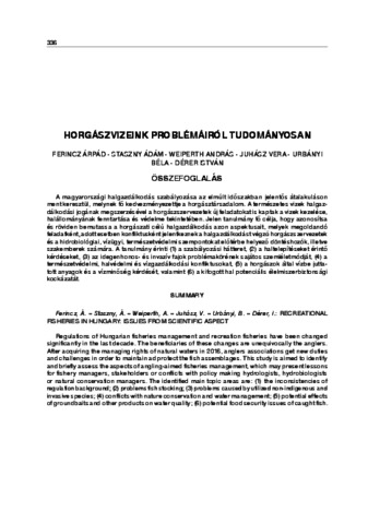 A magyarországi halgazdálkodás szabályozása az elmúlt időszakban jelentős átalakuláson ment keresztül, melynek fő kedvezményezettje a horgásztársadalom. A természetes vizek halgazdálkodási jogának megszerzésével a horgászszervezetek új feladatokat is kaptak a vizek kezelése, halállományának fenntartása és védelme tekintetében. Jelen tanulmány fő célja, hogy azonosítsa és röviden bemutassa a horgászati célú halgazdálkodás azon aspektusait, melyek megoldandó feladatként, adott esetben konfliktusként jelentkeznek a halgazdálkodást végző horgászszervezetek és a hidrobiológiai, vízügyi, természetvédelmi szempontokat előtérbe helyező döntéshozók, illetve szakemberek számára. A tanulmány érinti (1) a szabályozási hátteret, (2) a haltelepítéseket érintő kérdéseket, (3) az idegenhonos- és invazív fajok problémakörének sajátos szemléletmódját, (4) a természetvédelmi, halvédelmi és vízgazdálkodási konfliktusokat, (5) a horgászok által vízbe juttatott anyagok és a vízminőség kérdését, valamint (6) a kifogott hal potenciális élelmiszerbiztonsági kockázatát.