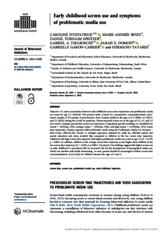 Fitzpatrick, Caroline and Binet, Marie-Andrée and Spritzer, Daniel Tornaim and Tiraboschi, Gabriel A. and Domoff, Sarah E. and Garon-Carrier, Gabrielle and Tavares, Hermano (2025) Early childhood screen use and symptoms of problematic media use. JOURNAL OF BEHAVIORAL ADDICTIONS, 14 (3). pp. 1411-1418. ISSN 2062-5871