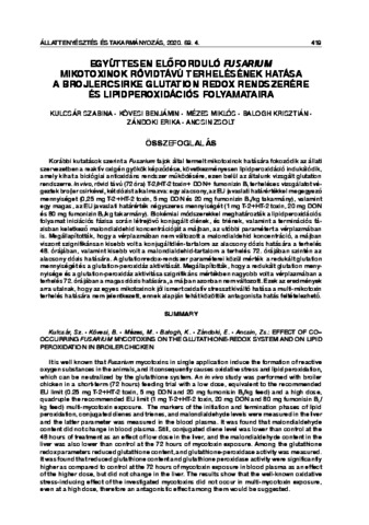 Korábbi kutatások szerint a Fusarium fajok által termelt mikotoxinok hatására fokozódik az állati szervezetben a reaktív oxigén gyökök képződése, következményesen lipidperoxidáció indukálódik, amely kihat a biológiai antioxidáns rendszer működésére, ezen belül az általunk vizsgált glutation rendszerre. In vivo, rövid távú (72 óra) T-2/HT-2 toxin+ DON+ fumonizin B1 terheléses vizsgálatot végeztek brojler csirkével, két dózist alkalmazva: egy alacsony, az EU javaslati határértékkel megegyező mennyiséget (0,25 mg T-2+HT-2 toxin, 5 mg DON és 20 mg fumonizin B1 /kg takarmány), valamint egy magas, az EU javaslati határérték négyszeres mennyiségét (1 mg T-2+HT-2 toxin, 20 mg DON és 80 mg fumonizin B1 /kg takarmány). Biokémiai módszerekkel meghatározták a lipidperoxidációs folyamat iniciációs fázisa során létrejövő konjugált diének, és triének, valamint a terminációs fázisban keletkező malondialdehid koncentrációját a májban, az utóbbi paramétert a vérplazmában is. Megállapították, hogy a vérplazmában nem változott a malondialdehid koncentráció, a májban viszont szignifikánsan kisebb volt a konjugáltdién-tartalom az alacsony dózis hatására a terhelés 48. órájában, valamint kisebb volt a malondialdehid-tartalom a terhelés 72. órájában szintén az alacsony dózis hatására. A glutationredox-rendszer paraméterei közül mérték a redukált glutation mennyiségét és a glutation-peroxidáz aktivitását. Megállapították, hogy a redukált glutation men - nyisége és a glutation-peroxidáz aktivitása szignifikáns mértékben nagyobb volt a vérplazmában a terhelés 72. órájában a magas dózis hatására, a májban azonban nem változott. Ezek az eredmények arra utalnak, hogy az egyes mikotoxinok jól ismert oxidatív stresszt kiváltó hatása a multi-mikotoxin terhelés hatására nem jelentkezett, ennek alapján tehát közöttük antagonista hatás feltételezhető.