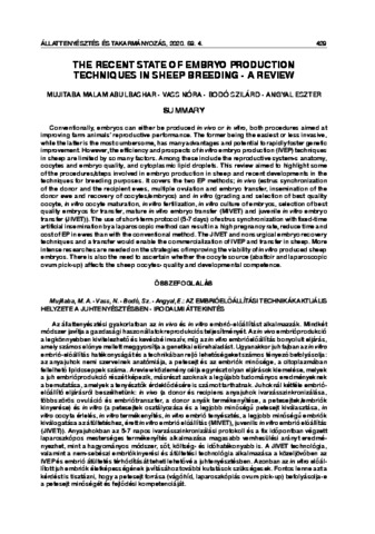 Mujitaba, Malam Abulbashar and Vass, Nóra and Bodó, Szilárd and Angyal, Eszter (2020) The recent state of embryo production techniques in sheep breeding. ÁLLATTENYÉSZTÉS ÉS TAKARMÁNYOZÁS, 69 (4). pp. 429-443. ISSN 0230-1814