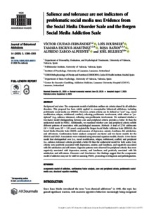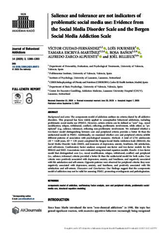 Ciudad-Fernández, Víctor and Fournier, Loïs and Escrivá-Martínez, Tamara and Baños, Rosa and Zarco-Alpuente, Alfredo and Billieux, Joël (2025) Salience and tolerance are not indicators of problematic social media use: Evidence from the Social Media Disorder Scale and the Bergen Social Media Addiction Scale. JOURNAL OF BEHAVIORAL ADDICTIONS, 14 (3). pp. 1380-1393. ISSN 2062-5871
