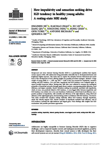 He, Jingzhen and Zhao, Haichao and Lei, Xu and Qiu, Jiang and Feng, Tingyong and Chen, Hong and Turel, Ofir and Bechara, Antoine and He, Qinghua (2025) How impulsivity and sensation seeking drive IGD tendency in healthy young adults: A resting-state MRI study. JOURNAL OF BEHAVIORAL ADDICTIONS, 14 (3). pp. 1343-1354. ISSN 2062-5871
