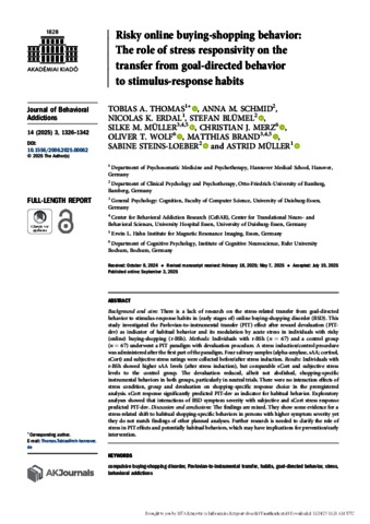 Thomas, Tobias A. and Schmid, Anna M. and Erdal, Nicolas K. and Blümel, Stefan and Müller, Silke M. and Merz, Christian J. and Wolf, Oliver T. and Brand, Matthias and Steins-Loeber, Sabine and Müller, Astrid (2025) Risky online buying-shopping behavior: The role of stress responsivity on the transfer from goal-directed behavior to stimulus-response habits. JOURNAL OF BEHAVIORAL ADDICTIONS, 14 (3). pp. 1326-1342. ISSN 2062-5871