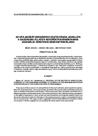 Mézes, Miklós and Kovács, Melinda and Mesterházy, Ákos (2021) Az MTA agrártudományok osztályának javaslata a gazdasági állatok keveréktakarmányainak maximális mikotoxin koncentrációjára. ÁLLATTENYÉSZTÉS ÉS TAKARMÁNYOZÁS, 70 (2). pp. 71-81. ISSN 0230-1814
