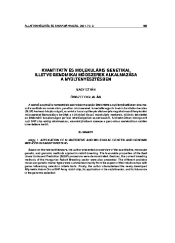A szerző az aktuális nemzetközi szakirodalom alapján áttekintette a nyúltenyésztésben alkalmazott kvantitatív és molekuláris genetikai módszereket. Ismertette legjobb lineáris torzítatlan becslés (BLUP) kedvező tulajdonságait, valamint a hazai nyúltenyésztésben jelenleg alkalmazott tenyésztési módszereket Bemutatásra kerültek a különböző típusú molekuláris markerek, különös tekintettel az értékmérő tulajdonságok javítási lehetőségeinek aspektusából. A közelmúltban kidolgozott nyúl SNP chip eddigi alkalmazásai, valamint jövőbeni szerepe a genomikus szelekcióban szintén ismertetésre került.