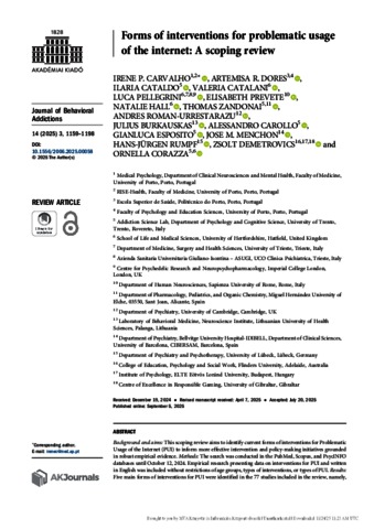 Carvalho, Irene P. and Dores, Artemisa R. and Cataldo, Ilaria and Catalani, Valeria and Pellegrini, Luca and Prevete, Elisabeth and Hall, Natalie and Zandonai, Thomas and Roman-Urrestarazu, Andres and Burkauskas, Julius and Carollo, Alessandro and Esposito, Gianluca and M. Menchon, Jose and Rumpf, Hans-Jürgen and Demetrovics, Zsolt and Corazza, Ornella (2025) Forms of interventions for problematic usage of the internet: A scoping review. JOURNAL OF BEHAVIORAL ADDICTIONS, 14 (3). pp. 1159-1198. ISSN 2062-5871