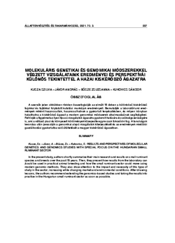 Kusza, Szilvia and Jávor, András and Bősze, Zsuzsanna and Kukovics, Sándor (2021) Molekuláris genetikai és genomikai módszerekkel végzett vizsgálataink eredményei és perspektívái különös tekintettel a hazai kiskérődző ágazatra. ÁLLATTENYÉSZTÉS ÉS TAKARMÁNYOZÁS, 70 (3). pp. 207-236. ISSN 0230-1814