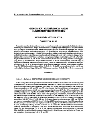 Anton, István and Zsolnai, Attila (2021) Genomikai kutatások a hazai húsmarhatenyésztésben. ÁLLATTENYÉSZTÉS ÉS TAKARMÁNYOZÁS, 70 (3). pp. 237-249. ISSN 0230-1814