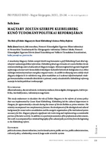 A tanulmány Magyary Zoltán szerepét kísérli meg bemutatni a gróf Klebelsberg Kunó által végrehajtott tudománypolitikai reformban. Klebelsberg közel egy évtizeden át vezette Bethlen István miniszterelnöksége alatt a kultusztárcát Magyarországon. Miniszterségének két egymást kiegészítő sajátossága a konzervatív konszolidáció ideológiaikulturális hátterének kidolgozása és az ehhez szükséges intézményrendszer energikus megszervezése. Az utóbbi tevékenység nem csekély részét Magyary dolgozta ki és valósította meg. Jelen munkában az ő szakmai teljesítményének részleges bemutatásához minimális életútleírás is párosul, amely a kezdetektől a klebelsbergi reformig mutatja be kultúrpolitikusi tevékenységét. | This study endeavours to elucidate the role of Zoltán Magyary in the reform of science policy that was implemented by Count Kunó Klebelsberg. Klebelsberg led the cultural department in Hungary for approximately a decade during the tenure of István Bethlen as prime minister. His ministry encompassed two complementary features: the development of the ideological and cultural background for conservative consolidation and the energetic organisation of the institutional system necessary for this. Magyary played a significant role in devising and implementing a considerable portion of the latter activity. In addition to a partial presentation of his professional achievements, this work is accompanied by a minimal biography of his cultural policy activities from the beginning to the Klebelsberg reform.