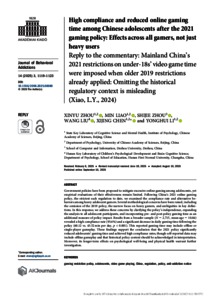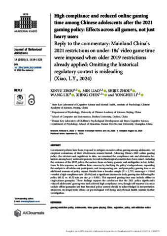 Zhou, Xinyu and Liao, Min and Zhou, Shijie and Liu, Wang and Chen, Xijing and Li, Yonghui (2025) High compliance and reduced online gaming time among Chinese adolescents after the 2021 gaming policy: Effects across all gamers, not just heavy users. JOURNAL OF BEHAVIORAL ADDICTIONS, 14 (3). pp. 1119-1123. ISSN 2062-5871