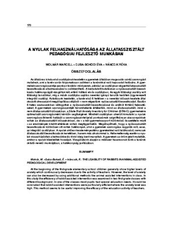 Az általános iskola első osztályának kezdetén a gyerekek általában magasabb szintű szorongást mutatnak, ami a tanév során folyamatosan csökken a tanárokkal való kapcsolat hatására. A gyermekek szorongásszintje azonban további módszerek, például az osztályban végzett állatasszisztált beavatkozások alkalmazásával is csökkenthető. A bemutatott kutatásban a nyúlasszisztált beavatkozás hatékonyságát vizsgáltuk két, eltérő hátterű elsős osztályban. Az egyik többségi osztály volt többségi tanulókkal, míg a másik osztályba sajátos nevelési igényű tanulók kerültek (úgynevezett integráló osztály). Kutatásunk kezdetén, a tanév első 6 hetében – a nevelési időszak kezdete által okozott stresszszint megállapítása céljából – nem végeztünk nyúlasszisztált beavatkozást. Ezután 6 hetes szakaszokban váltogattuk a nyúlasszisztált beavatkozással és anélkül történő fejlesztéseket. A gyermekek szorongásszintjét háromhetente értékeltük, mind az állatasszisztált, mind a nem állatasszisztált időszakban, a State-Trait Anxiety Inventory for Children (STAI-C) gyermekekre optimalizált szorongásmérő kérdőív segítségével. Mindkét osztályban sikerült kimutatni a nyulak szorongáscsökkentő hatását: a szorongásszintet jelző pontszámok szignifikánsan alacsonyabbak voltak az állatasszisztált időszakokban, de – a két gyermekcsoport különböző összetétele miatt – az eredmények között eltérések voltak megfigyelhetők. Megállapítható, hogy a nyúlasszisztált beavatkozások különösen ott voltak hatékonyak, ahol a gyerekek szorongása nagyobb volt, azaz, az integráló osztályban. A nyulak aktívan kezdeményezték a gyerekekkel való találkozást, nemcsak állatasszisztált beavatkozások keretében, hanem más alkalommal is. Kellemetlenség esetén a nyulak visszahúzódtak a ketrecükbe és rövid ideig bent maradtak. A gyerekek az öröm jeleit mutatták, amikor a nyulak közeledtek hozzájuk. Vizsgálataink alapján a módszer hasznosnak tűnik a tanárok oktató-nevelő munkájában, a hatékonyság javításában.