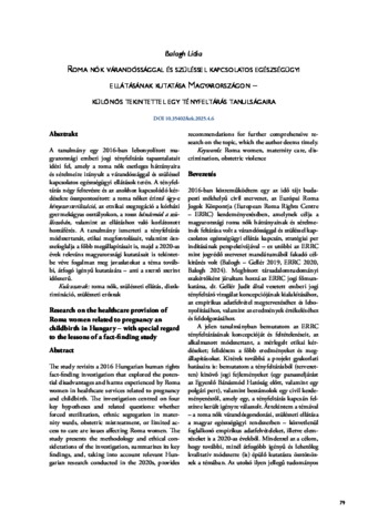 A tanulmány egy 2016-ban lebonyolított magyarországi emberi jogi tényfeltárás tapasztalatait idézi fel, amely a roma nők esetleges hátrányaira és sérelmeire irányult a várandóssággal és szüléssel kapcsolatos egészségügyi ellátások terén. A tényfeltárás négy feltevésre és az azokhoz kapcsolódó kérdésekre összpontosított: a roma nőket érintő ügy-e kényszersterilizáció, az etnikai szegregáció a kórházi gyermekágyas osztályokon, a rossz bánásmód a szülőszobán, valamint az ellátáshoz való korlátozott hozzáférés. A tanulmány ismerteti a tényfeltárás módszertanát, etikai megfontolásait, valamint ös - szefoglalja a főbb megállapításait is, majd a 2020-as évek releváns magyarországi kutatásait is tekintetbe véve fogalmaz meg javaslatokat a téma további, átfogó igényű kutatására – ami a szerző szerint időszerű. | The study revisits a 2016 Hungarian human rights fact-finding investigation that explored the potential disadvantages and harms experienced by Roma women in healthcare services related to pregnancy and childbirth. The investigation centred on four key hypotheses and related questions: whether forced sterilization, ethnic segregation in maternity wards, obstetric mistreatment, or limited access to care are issues affecting Roma women. The study presents the methodology and ethical considerations of the investigation, summarizes its key findings, and, taking into account relevant Hungarian research conducted in the 2020s, provides recommendations for further comprehensive research on the topic, which the author deems timely.