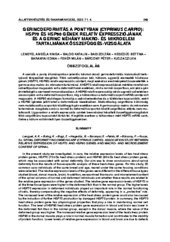 Lengyel, Angéla Kinga and Balog, Katalin and Bagi, Zoltán and Hegedűs, Bettina and Baranyai, Edina and Fehér, Milán and Bársony, Péter and Kusza, Szilvia (2022) Gerincdeformitás a pontyban (Cyprinus Carpio): HSP70 és HSP90 gének relatív expressziójának és a gerinc néhány makro- és mikroelem tartalmának összefüggés-vizsgálata. ÁLLATTENYÉSZTÉS ÉS TAKARMÁNYOZÁS, 71 (4). pp. 249-269. ISSN 0230-1814