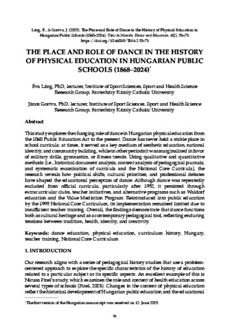 Láng, Éva and Gortva, János (2025) The Place and Role of Dance in the History of Physical Education in Hungarian Public Schools (1868–2024). TÁNC ÉS NEVELÉS / DANCE AND EDUCATION, 6 (2). pp. 53-73. ISSN 2732-1002