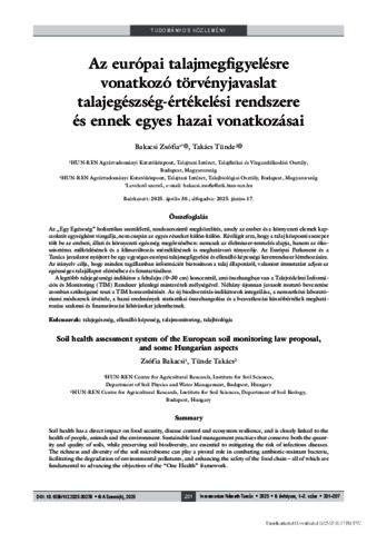Bakacsi, Zsófia and Takács, Tünde (2025) Az európai talajmegfigyelésre vonatkozó törvényjavaslat talajegészség-értékelési rendszere és ennek egyes hazai vonatkozásai = Soil health assessment system of the European soil monitoring law proposal, and some Hungarian aspects. SCIENTIA ET SECURITAS, 6 (1-2). pp. 201-207. ISSN 3057-9759
