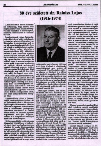 Horváth, József (1996) 80 éve született dr. Rainiss Lajos (1916-1974). AGROFÓRUM, 7 (7). pp. 48-49. ISSN 1215-4911