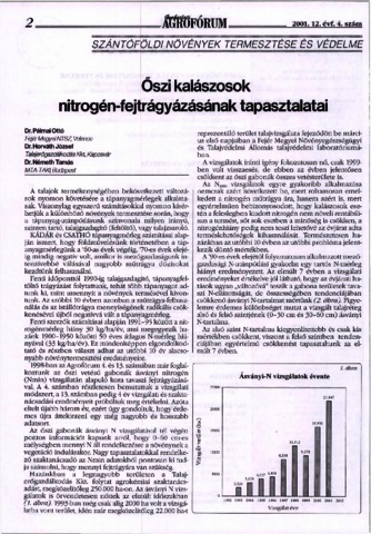 Horváth, József and Pálmai, O. and Németh, Tamás (2001) Őszi kalászosok nitrogén-fejtrágyázásának tapasztalatai. GYAKORLATI AGROFÓRUM, 12 (4). pp. 2-3. ISSN 1416-0927