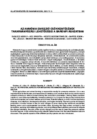 Dublecz, Károly and Kiss, Brigitta and Kesete Goitom, Tewelde and Bartos, Ádám and Pál, László and Magyar, Marianna and Benedek, Zsuzsanna and Such, Nikoletta (2023) Az ammónia emisszió csökkentésének takarmányozási lehetőségei a baromfi ágazatban. ÁLLATTENYÉSZTÉS ÉS TAKARMÁNYOZÁS, 72 (3). pp. 231-246. ISSN 0230-1814
