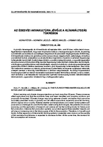 Horn, Péter and Horváth, László and Mézes, Miklós and Urbányi, Béla (2023) Az édesvízi akvakultúra jövője a klímaváltozás tükrében. ÁLLATTENYÉSZTÉS ÉS TAKARMÁNYOZÁS, 72 (3). pp. 247-264. ISSN 0230-1814