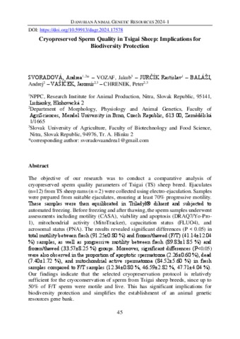 Chrenek, Peter (2024) Cryopreserved Sperm Quality in Tsigai Sheep: Implications for Biodiversity Protection. DANUBIAN ANIMAL GENETIC RESOURCES, 9 (1). pp. 45-53. ISSN 2498-5910