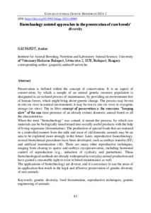 Preservation is defined within the concept of conservation. It is an aspect of conservation, by which a sample of an animal genetic resource population is designated to an isolated process of maintenance, by providing an environment free of human forces, which might bring about genetic change. The process may be run in situ (in vivo) in natural environment; it may be run ex situ (in vivo) or cryogenic storage (in vitro). The in libro concept of preservation is the conscious “keeping alive” of the one-time presence of an already extinct domestic animal breed or all the characteristics.When the term "biotechnology" was coined, it meant the process, by which raw materials can be biologically transformed into socially useful products with the help of living organisms (fermentation). The production of special foods that are matured in a controlled manner from the milk and meat of old domestic animals may be an area to be exploited more strongly in the future. Later, reproductive biotechnology, several biotechnical procedures have been developed, such as embryo transfer (ET) and artificial insemination (AI). There are many other reproductive techniques, ranging from cloning to sperm and embryo cryopreservation, including hormonal control of reproduction (e.g., induction of cyclicity and parturition). These biotechnological methods are already widespread in everyday animal production and have gained a reasonable right to exist in breed maintenance as well.The applications of biotechnology are diverse, and it is necessary to use the areas of its application that result in the legal and effective preservation of genetic diversity of rare animals.