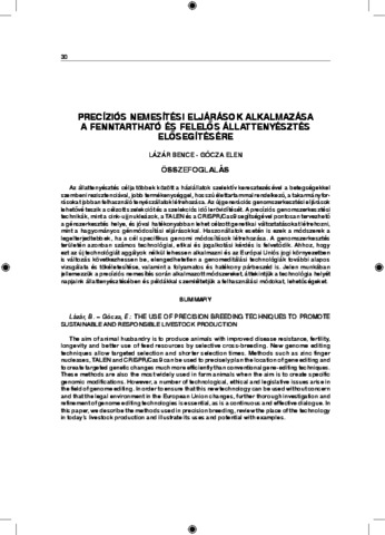 Az állattenyésztés célja többek között a háziállatok szelektív keresztezésével a betegségekkel szembeni rezisztenciával, jobb termékenységgel, hosszú élettartammal rendelkező, a takarmányforrásokat jobban felhasználó tenyészállatok létrehozása. Az új generációs genomszerkesztési eljárások lehetővé teszik a célzott szelekciót és a szelekciós idő lerövidítését. A precíziós genomszerkesztési technikák, mint a cink-ujj nukleázok, a TALEN és a CRISPR/Cas9 segítségével pontosan tervezhető a génszerkesztés helye, és jóval hatékonyabban lehet célzott genetikai változtatásokat létrehozni, mint a hagyományos génmódosítási eljárásokkal. Haszonállatok esetén is ezek a módszerek a legelterjedtebbek, ha a cél specifikus genomi módosítások létrehozása. A genomszerkesztés területén azonban számos technológiai, etikai és jogalkotási kérdés is felvetődik. Ahhoz, hogy ezt az új technológiát aggályok nélkül lehessen alkalmazni és az Európai Uniós jogi környezetben is változás következhessen be, elengedhetetlen a genomeditálási technológiák további alapos vizsgálata és tökéletesítése, valamint a folyamatos és hatékony párbeszéd is. Jelen munkában jellemezzük a precíziós nemesítés során alkalmazott módszereket, áttekintjük a technológia helyét napjaink állattenyésztésében és példákkal szemléltetjük a felhasználási módokat, lehetőségeket.
