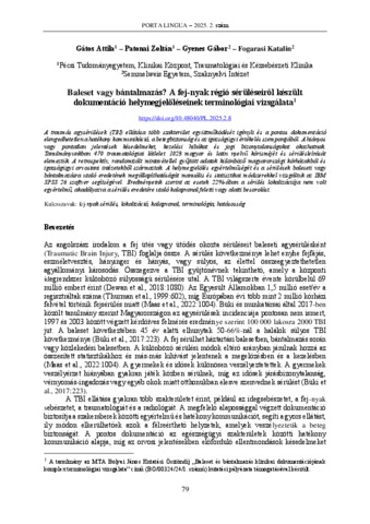 Gátos, Attila and Patonai, Zoltán and Gyenes, Gábor and Fogarasi, Katalin (2025) Baleset vagy bántalmazás? A fej-nyak régió sérüléseiről készült dokumentáció helymegjelöléseinek terminológiai vizsgálata. PORTA LINGUA, 2025 (2). pp. 79-85. ISSN 1785-2420