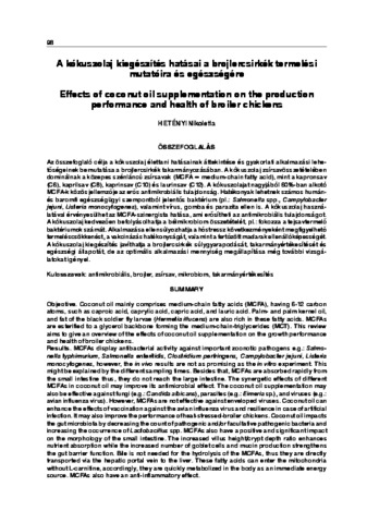 Az összefoglaló célja a kókuszolaj élettani hatásainak áttekintése és gyakorlati alkalmazási lehetőségeinek bemutatása a brojlercsirkék takarmányozásában. A kókuszolaj zsírsavösszetételében dominálnak a közepes szénláncú zsírsavak (MCFA = medium-chain fatty acid), mint a kapronsav (C6), kaprilsav (C8), kaprinsav (C10) és laurinsav (C12). A kókuszolajat nagyjából 60%-ban alkotó MCFA-k közös jellemzője az erős antimikrobiális tulajdonság. Hatékonyak lehetnek számos humánés baromfi egészségügyi szempontból jelentős baktérium (pl.: Salmonella spp., Campylobacter jejuni, Listeria monocytogenes), valamint vírus, gomba és parazita ellen is. A kókuszolaj használatával érvényesülhet az MCFA-szinergista hatása, ami erősítheti az antimikrobiális tulajdonságot. A kókuszolaj kedvezően befolyásolhatja a bélmikrobiom összetételét, pl.: fokozza a tejsavtermelő baktériumok számát. Alkalmazása ellensúlyozhatja a hőstressz következményeként megfigyelhető termeléscsökkenést, a vakcinázás hatékonyságát, valamint a fertőzött madarak ellenállóképességét. A kókuszolaj kiegészítés javíthatja a brojlercsirkék súlygyarapodását, takarmányértékesítését és egészségi állapotát, de az optimális alkalmazási mennyiség megállapítása még további vizsgálatokat igényel.