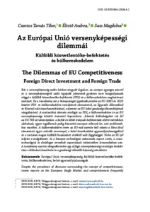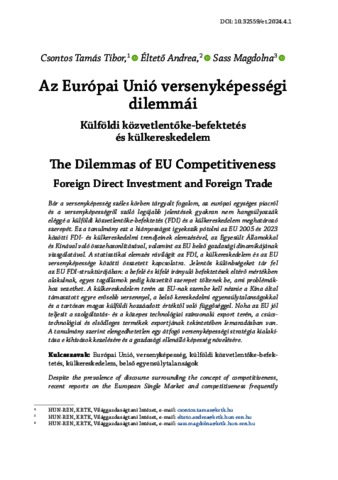 Csontos, Tamás Tibor and Éltető, Andrea and Tölgyessy Péterné Sass, Magdolna (2024) Az Európai Unió versenyképességi dilemmái : Külföldi közvetlentőke-befektetés és külkereskedelem = The Dilemmas of EU Competitiveness : Foreign Direct Investment and Foreign Trade. EURÓPAI TÜKÖR: AZ INTEGRÁCIÓS STRATÉGIAI MUNKACSOPORT KÉTHAVONTA MEGJELENŐ FOLYÓIRATA, 27 (4). pp. 7-34. ISSN 1416-6151
