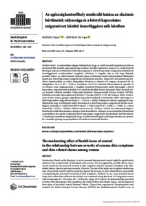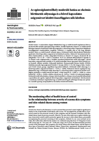 Elméleti háttér: A szakirodalom alapján feltételezhető, hogy az észlelt kontroll meghatározó lehet az ekcémával élők mentális egészségével kapcsolatban. Korábbi kutatásokra alapozva az észlelt kontroll lehetséges hatásait a bőrtünetek észlelt súlyosságának és a bőrrel kapcsolatos szégyenérzet feltételezett összefüggésének vonatkozásában vizsgáltuk. Célkitűzés: A vizsgálat célja az volt, hogy feltárjuk, protektív lehet-e az észlelt kontroll valamely típusa a bőrtünetek észlelt súlyosbodásával feltehetően együtt járó, bőrrel kapcsolatos szégyenérzet-növekedéssel szemben. Módszerek: Keresztmetszeti, kérdőíves kutatásunkban az online adatgyűjtést követően az elemzést 113 magyar, ekcémával élő nő ( átlagéletkor: 34,5 év, SD = 12,09 év, terjedelem: 19–67 év) adatának felhasználásával végeztük el. Az elemzés során meghatároztuk a vizsgálati személyek bőrtüneteinek észlelt súlyosságát, a bőrrel kapcsolatos szégyenérzetük mértékét és az észlelt kontrolljuk három típusának (belső kontroll, társas kontroll, véletlen) mértékét. Felhasznált kérdőívek: Páciensorientált Ekcéma Kérdőív (POEM), Multidimenzionális Egészségkontroll Kérdőív C formája (MHLC-C-H), Bőr Szégyen Skála. Eredmények: Pozitív irányú, gyenge, szignifikáns kapcsolatot találtunk a bőrtünetek észlelt súlyossága és a bőrrel kapcsolatos szégyenérzet között ( r = 0,234; p = 0,006). Moderációs elemzés segítségével megállapítottuk, hogy a bőrtünetek észlelt súlyossága és a bőrrel kapcsolatos szégyenérzet közötti összefüggést moderálja az észlelt kontroll két típusa, a belső kontroll ( β = 0,208; p = 0,026) és a társas kontroll ( β = 0,220; p = 0,018), a véletlen viszont nem ( β = 0,074; p = 0,444). Az eredmények alapján a bőrtünetek észlelt súlyosbodása a közepes belső kontrollal és a közepes társas kontrollal jellemezhető csoportokban járt együtt a legkisseb bőrrel kapcsolatos szégyenérzet-növekedéssel. Következtetések: A tanulmány eredményei megerősítik, hogy az észlelt kontroll egyik szélsőséges formája sem optimális a mentális egészség szempontjából az ekcémában érintett nők körében. | Introduction: Based on the literature, it can be assumed that perceived control might be significant in relation to the mental health of individuals with eczema. We investigated the possible effects of perceived control on the perceived severity of skin symptoms and the assumed correlation with skin- related shame, based on previous research. Objective: The aim of the study was to explore whether any type of perceived control could be protective against the increase in skin-related shame, presumably accompanying the perceived worsening of skin symptoms. Methods: In our cross-sectional survey study, after online data collection the analysis was conducted using data from 113 Hungarian women with eczema (age; M = 34.5 years, SD = 12.09 years, range: 19–67 years). We determined the perceived severity of the participants’ skin symptoms, the extent of their skin-related shame, and the degree of three types of perceived control (Internal, Others, Chance) they experienced. Questionnaires used included the Patient-Oriented Eczema Measure (POEM), the Multidimensional Health Locus of Control Scale – Form C (MHLC-C-H), and the Skin Shame Scale. Results: There is a positive, weak significant relationship between the perceived severity of skin symptoms and skin-related shame (r = 0.234, p = 0.006). With moderation analysis, we concluded that the correlation between the perceived severity of skin symptoms and skin-related shame was moderated by two types of perceived control: Internal (β = 0.208, p = 0.026) and Others (β = 0.220, p = 0.018), while Chance did not have a moderating effect (β = 0.074, p = 0.444). The results of the study indicate that the perceived worsening of skin symptoms was associated with the smallest increase in skin-related shame in groups characterized by moderate Internal and Others. Conclusions: The study confirms that neither extreme form of perceived control is optimal for the mental health of individuals with eczema.