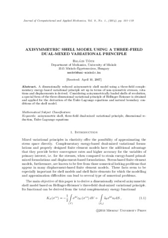 Tóth, Balázs (2014) Axisymmetric shell model using a three-field dual-mixed variational principle. JOURNAL OF COMPUTATIONAL AND APPLIED MECHANICS, 9 (1). pp. 101-119. ISSN 1586-2070