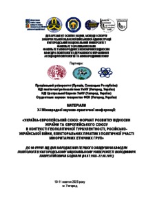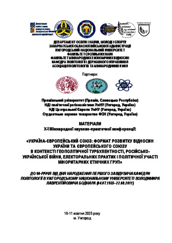 Fedinec, Csilla (2025) Права меншин та шлях України до початку переговорів щодо вступу до ЄС = Minority rights and Ukraine's path to the start of negotiations on EU accession. In: Україна – Європейський Союз: Формат розвитку відносин України та Європейського Союзу в контексті геополітичної турбулентності, російсько-української війни, електоральних практик і політичної участі міноритарних етнічних груп [Ukraine – European Union: The. TOV "RIK-U"; Uzhgorodskij Nacionalnyj Universitet, Uzhgorod, pp. 236-241. ISBN 9786178596330