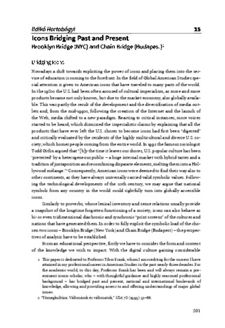 Hortobágyi, Ildikó (2019) Icons Bridging Past and Present : Brooklyn Bridge (NYC) and Chain Bridge (Budapest). In: Az emberi sors és a történelem kereszteződésében : Tanulmánykötet Frank Tibor 70. születésnapjára = At the Crossroads of Human Fate and History : Studies in Honour of Tibor Frank on His 70th Birthday. Eötvös Loránd Tudományegyetem Bölcsészettudományi Kar Angol-Amerikai Intézet, Budapest, pp. 201-215. ISBN 978-963-489-041-6