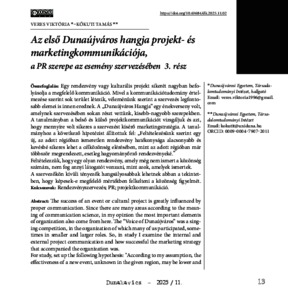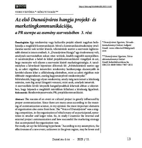 Veres, Viktória and Kőkuti, Tamás (2025) Az első Dunaújváros hangja projekt- és marketingkommunikációja, a PR szerepe az esemény szervezésében 3. rész. DUNAKAVICS, 13 (11). pp. 13-23. ISSN 2064-5007