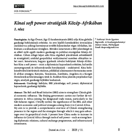 Dús, Pongrác (2025) Kínai soft power stratégiák Közép-Afrikában. DUNAKAVICS, 2025 (11). pp. 5-12. ISSN 2064-5007