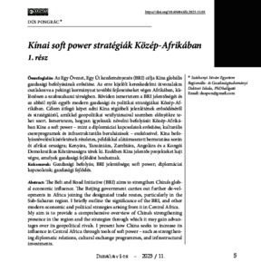 Az Egy Övezet, Egy Út kezdeményezés (BRI) célja Kína globális gazdasági befolyásának erősítése. Az erre kijelölt kereskedelmi útvonalakra csatlakozva a pekingi kormányzat további fejlesztéseket végez Afrikában, különösen a szubszaharai térségben. Röviden ismertetem a BRI jelentőségét és az abból nyíló egyéb modern gazdasági és politikai stratégiákat Közép-Afrikában. Célom átfogó képet adni Kína régióbeli jelenlétének erősödéséről és stratégiáiról, amikkel geopolitikai vetélytársaival szemben előnyökre tehet szert. Ismertetem, hogyan igyekszik növelni befolyását Közép-Afrikában Kína a soft power – mint a diplomáciai kapcsolatok erősítése, kulturális csereprogramok és infrastrukturális beruházások – eszközeivel. Kína befolyásnövelési kísérletének részletes, példákkal alátámasztott bemutatása során öt afrikai országra; Kenyára, Tanzániára, Zambiára, Angolára és a Kongói Demokratikus Köztársaságra térek ki. Ezekben Kína jelentős projekteket hajt végre, amelyek gazdasági fejlődést hozhatnak.