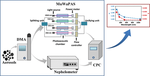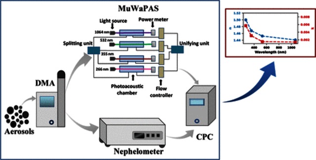 Accurate determination of the aerosol complex refractive index (RI) is crucial for modeling atmospheric radiative forcing, yet it remains challenging due to limitations in conventional measurement techniques. This study demonstrates a novel and robust methodology for retrieving wavelength-dependent complex RI (m = n + ik) through integrated, simultaneous measurements of aerosol absorption, scattering, and size distribution. We combine multiwavelength photoacoustic spectroscopy (PAS) for filter-free absorption coefficients, integrating nephelometry for angular-resolved scattering, and scanning mobility particle sizing (SMPS) for high-resolution size distribution measurements. Using diethyl-hexyl-sebacate (DEHS) aerosols as a benchmark, we introduce an inverse algorithm based on Rayleigh theory in the near-IR to visible range and Modified Anomalous Diffraction Theory (MADT) in the UV wavelength regime for RI retrieval, overcoming Mie theory instabilities for RI retrieval in the so-called transition region, where particle dimensions are comparable to wavelength. The retrieved RI values agree with bulk ellipsometry measurements within Δn = 0.0011 and Δk = 0.00025. The integrated PAS–nephelometer–SMPS approach establishes a new paradigm for in situ aerosol RI determination with direct applications in climate modeling and remote sensing validation.