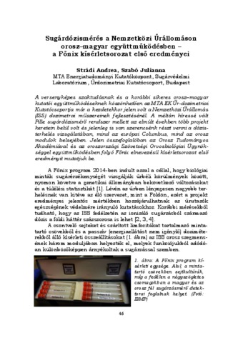 Strádi, Andrea and Szabó, Julianna (2017) Sugárdózismérés a Nemzetközi Űrállomáson orosz–magyar együttműködésben - a Főnix kísérletsorozat első eredményei. ŰRTAN ÉVKÖNYV, 2016. pp. 46-51. ISSN 1788-7771