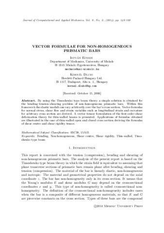 Ecsedi, István and Dluhi, Kornél (2014) Vector formulae for non-homogeneous prismatic bars. JOURNAL OF COMPUTATIONAL AND APPLIED MECHANICS, 9 (2). pp. 149-169. ISSN 1586-2070