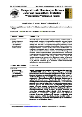 Abdul Rahim, Noor Roziana Binti and Kovács, Zsolt (2025) Comparative air flow analysis between Johor and Szombathely: evaluating woodcarving ventialltion panels. ACTA SILVATICA ET LIGNARIA HUNGARICA: AN INTERNATIONAL JOURNAL IN FOREST WOOD AND ENVIRONMENTAL SCIENCES, 21 (2). pp. 65-77. ISSN 1786-691X
