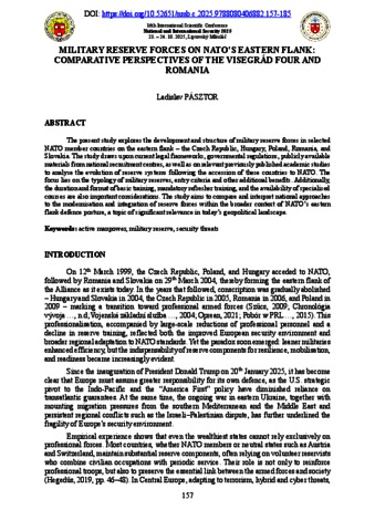 Pásztor, Ladislav (2025) Military Reserve Forces on NATO’s Eastern Flank : Comparative Perspectives of the Visegrád Four and Romania. In: Národná a medzinárodná bezpečnosť. Akadémia ozbrojených síl generála Milana Rastislava Štefánika, pp. 157-185. ISBN 9788080406882