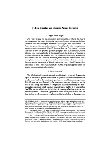 This Paper argues that the application of fundamental liberties to the federal government and the states, let them be enumerated or not, is based on different rationales and these divergent rationales should affect their application. The Paper’s argument is presented in six steps. Part II lays down the conceptual and terminological groundwork. Part III discusses how the Constitution’s creation story does or does not affect the question of inquiry. Part IV presents how federal liberties were made applicable to the states through the doctrines of incorporation and substantive due process. Part V explores the relationship between federal liberties and the structural matrix of federalism, and demonstrates that— aside from procedural due process and equal protection—diversity should be factored into the application of federal rights to the states. Part VI presents how this should be done. Part VII demonstrates that the proposed approach does not lead to lesser constitutional protection.