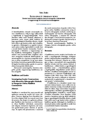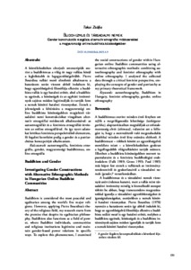 A közvélekedésben elterjedt sztereotípiák szerint a buddhizmus a világ öt nagy vallása közül a legbékésebb és legegyenlőségelvűbb. Pierre Bourdieu vallási mező elméletét alkalmazva a kutatásom során viszont abból indultam ki,hogy egyenlőségelvű filozófiája ellenére a buddhista vallás is egy hatalmi erőtér, ahol a buddhista egyének, a közösségek és az egyházi intézmények sajátos módon legitimálják és tartják fenn a nemek közötti hatalmi viszonyokat. Ennek a jelenségnek a feltárására a magyarországi online buddhista közösségekben megjelenő társadalmi nemi konstrukciókat vizsgáltam alternatív etnográfiai módszerek alkalmazásával: az autoetnográfiát és a feminista etnográfiát ötvöztem az online etnográfiával. Az így nyert adatokat kritikus feminista perspektívából elemeztem,fő fogalmi keretként pedig a gender és a patriarchátus koncepcióját alkalmaztam. | Buddhism is considered the most peaceful and egalitarian among the world’s five major religions. However, applying Pierre Bourdieu’s theory of the religious field, my research starts from the premise that despite its egalitarian philosophy, Buddhism also functions as a field of power, where Buddhist individuals, communities and religious institutions legitimize and maintain gender-based power relations in specific ways. To explore this phenomenon, I examined the social constructions of gender within Hungarian online Buddhist communities using alternative ethnographic methods: combining autoethnography and feminist ethnography with online ethnography. I analyzed the collected data through a critical feminist perspective, employing the concepts of gender and patriarchy as my primary theoretical framework.