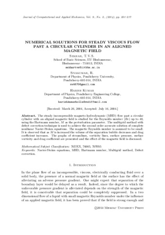 Sekhar, T. V. S. and Sivakumar, R. and Kumar, Harish (2014) Numerical solutions for steady viscous flow past a circular cylinder in an aligned magnetic field. JOURNAL OF COMPUTATIONAL AND APPLIED MECHANICS, 9 (2). pp. 201-217. ISSN 1586-2070