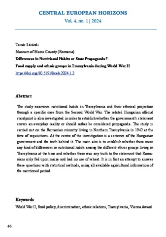 Sárándi, Tamás (2024) Differences in Nutritional Habits or State Propaganda? Food supply and ethnic groups in Transylvania during World War II. CENTRAL EUROPEAN HORIZONS, 4 (1). pp. 46-68. ISSN 2732-0456
