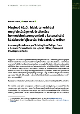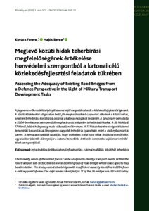 Kovács, Ferenc and Hajós, Bence (2025) Meglévő közúti hidak teherbírási megfelelőségének értékelése honvédelmi szempontból a katonai célú közlekedésfejlesztési feladatok tükrében. MŰSZAKI KATONAI KÖZLÖNY, 35 (2). pp. 5-17. ISSN 1219-4166